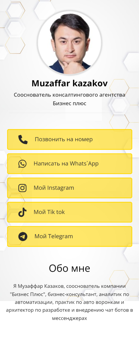 Наша электронная визитка - это современное и удобное решение для эффективного представления ваших контактных данных и профессиональной информации. Забудьте о бумажных визитках, которые легко теряются или забываются. С нашей электронной визиткой у вас всегда будет легкий доступ к актуальным контактам и информации о вашей деятельности.